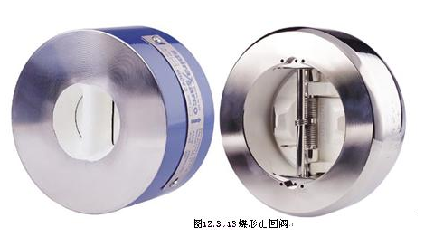 蝶形止回閥或雙盤式止回閥克服了擺動(dòng)式及碟片式止回閥的口徑和壓降限制,懸啟式止回閥的閥瓣被 一分為二,在中間鉸接。這樣兩個(gè)碟片只能在一個(gè)方向擺動(dòng),碟片靠裝在鉸鏈上的紐彈簧壓在閥座上。 為了能在流道中心有一個(gè)鉸鏈,需在外面安裝一個(gè)固定銷,這樣就會(huì)引起閥門的泄漏,設(shè)計(jì)改進(jìn)后 可在里面安裝,流體就可以密封在閥體內(nèi)部,不會(huì)泄漏到外面(見圖12.3.13)。