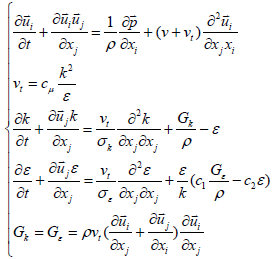擇單相流體的不可壓縮三維粘性流動(dòng)模型,采用不可壓縮流動(dòng)的雷諾方程組與k-ε湍流模型構(gòu)成封閉的方程組來(lái)描述,如式(1)所示。