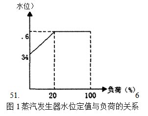 主給水泵的打出來的水經(jīng)過高壓加熱器后進(jìn)人一條給水母管,再由此分為兩條給水管路,通往兩臺(tái)蒸發(fā)器。每個(gè)給水調(diào)節(jié)站包括一個(gè)主給水調(diào)節(jié)閥和一個(gè)旁路調(diào)節(jié)閥,在主調(diào)節(jié)閥前后設(shè)電動(dòng)隔離閥,每臺(tái)蒸汽發(fā)生器裝有一個(gè)水位控制器,用于使蒸汽發(fā)生器保持一個(gè)隨負(fù)荷變化的預(yù)定水位。并聯(lián)安裝的主、旁路調(diào)節(jié)閥進(jìn)行給水流量調(diào)節(jié),以調(diào)節(jié)蒸發(fā)器的水位。主給水調(diào)節(jié)閥可保證1854t/h的流量(名義流量的 95%),旁路調(diào)節(jié)閥可保證的流量為293(名義流量的巧%)。當(dāng)負(fù)荷小于18.5%Pn時(shí),旁路調(diào)節(jié)閥獨(dú)自控制;當(dāng)負(fù)荷在1 &5%pn到100% pn之間時(shí),主給水調(diào)節(jié)閥和旁路調(diào)節(jié)閥都參與SG水位控制,此時(shí),旁路調(diào)節(jié)閥保持全開狀態(tài)。主給水調(diào)節(jié)閥和旁路調(diào)節(jié)閥可用電動(dòng)閥從上游和下游進(jìn)行隔離。 圖1給出了蒸汽發(fā)生器水位定值與負(fù)荷的關(guān)系。在(蒸汽)負(fù)荷小于20%pn時(shí),程序水位線性的從34%(零負(fù)荷時(shí))變化到5L6%(在 20%pn時(shí))。在負(fù)荷大于20%Pn時(shí),程序水位是恒定的,并設(shè)定為窄量程水位的5L6%。