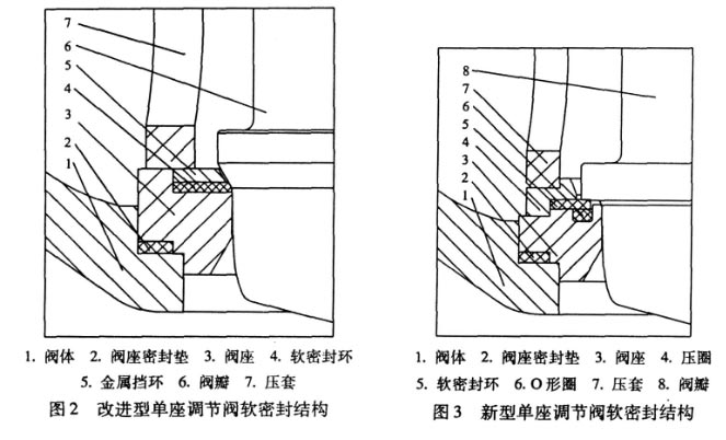 隨著工業技術的發展 ,用戶希望獲得更高質量的閥門 ,同時也要求提高閥門的使用、維修水平。這就對工程技術人員提出了新的要求 ,除了要精心設計出高質量和高水平的閥門 ,合理選用和正確操作之外 ,還要方便維修人員的維修和拆卸 ,方便快捷 , 使各類事故及維修時間降到最低限度。于是 ,對于單座調節閥來說 ,就出現了圖 2所示的改進型軟密封結構設計。在這種結構設計中 ,用金屬擋環和軟密封環代替了傳統結構中用螺釘固定嵌入式軟密封環的設計 ,用壓套和閥座密封墊直壓式結構設計代替了傳統結構中閥座采用螺紋連接的設計。這樣的設計優點是當閥瓣和閥座達到最后關閉位置時 ,閥瓣給閥座的部分力由金屬擋環承擔 ,并直接傳到閥座,這樣就排除了軟密封環因過載而損壞 ,而且金屬擋環還提供了一定的輔助密封作用。直壓式結構設計也改變了需要專用工裝才能拆卸的螺紋連接閥座設計 ,裝配與拆卸、現場維修與更換都十分方便。