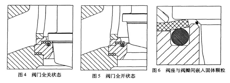 對于夾帶固體顆粒的流體介質 ,軟閥座閥門的密封結構更為重要。這主要是因為介質中夾帶有固體顆粒時 ,極容易卡在閥瓣和閥座的密封面之間 ,妨礙了閥座的密封 ,會引起泄漏 ,繼而由于介質的高速沖刷而使閥座表面被沖蝕破壞。對于上述具有二級關閉作用的軟閥座密封結構 (圖 6) ,即使出現了這種顆粒卡在閥瓣和閥座金屬密封部位之間 ,也不會有什么危害 ,因為還有閥瓣和軟閥座之間的密封 ,仍能起到可靠有效的補充密封作用。